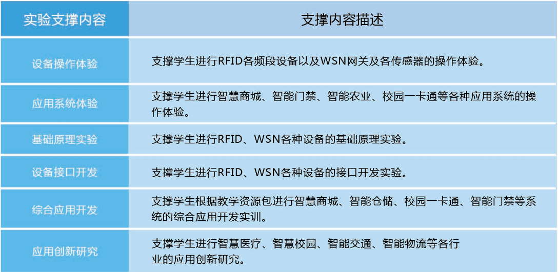 《物聯(lián)網(wǎng)虛擬仿真實驗平臺》虛擬仿真了各種RFID、WSN等常見的物聯(lián)網(wǎng)感知層設(shè)備。具有真實設(shè)備的完整接口和特性,可以通過串口及網(wǎng)絡(luò)進行訪問??梢灾蔚膶嶒瀮?nèi)容如下表所示: